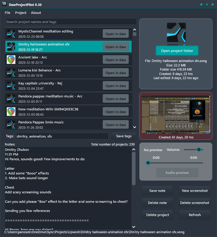 Originally built to streamline everyday workflow tasks for music production, DawProjectPilot now includes versioning, notes, screenshots, audio preview, and more.